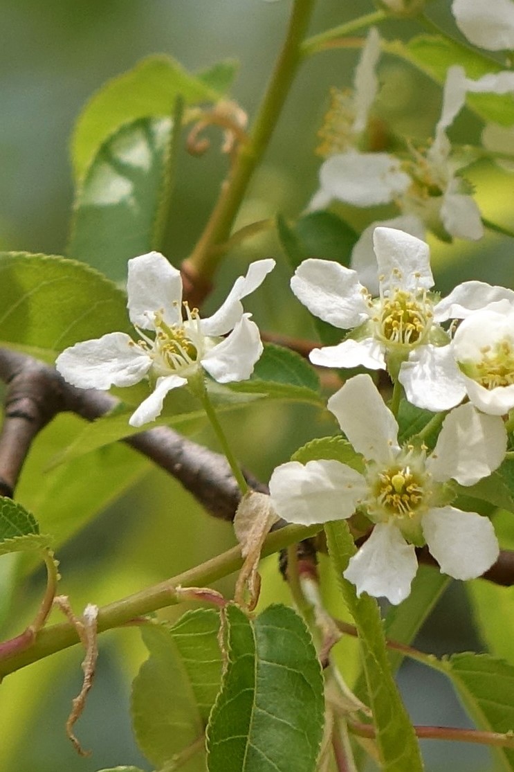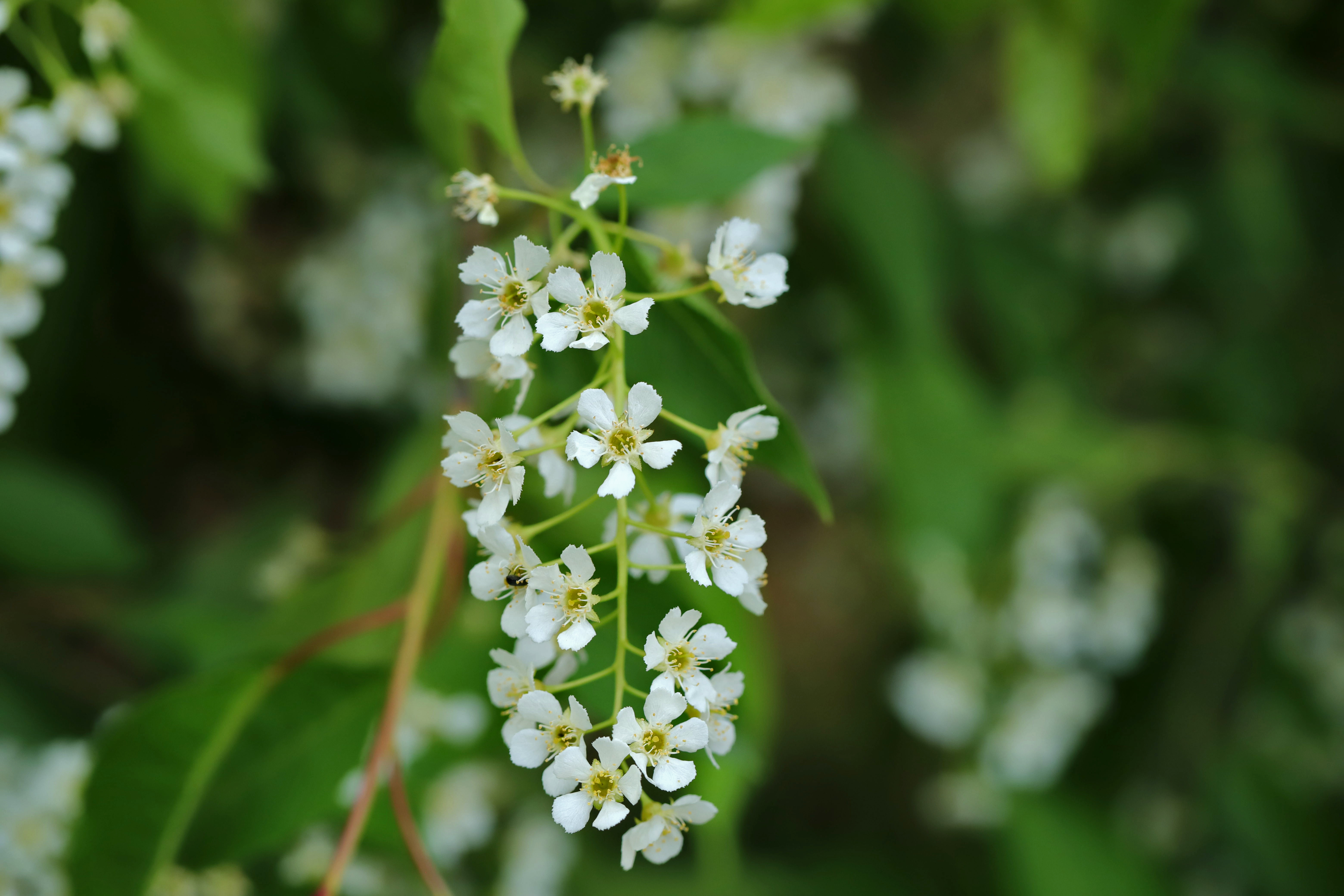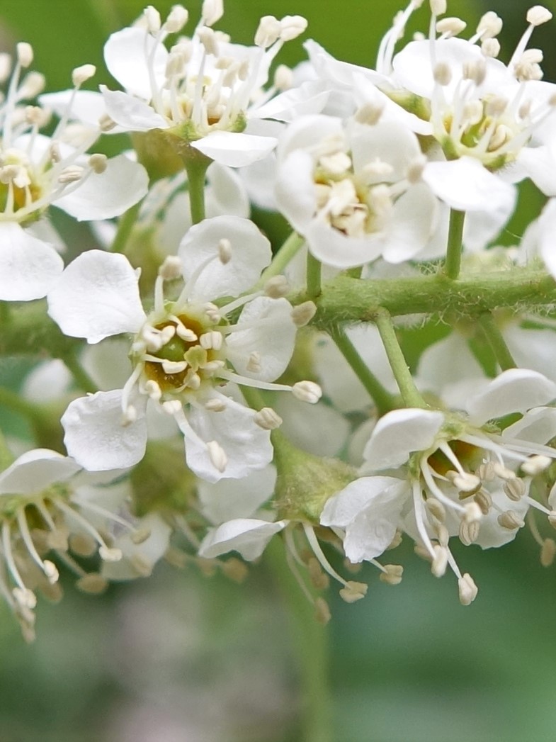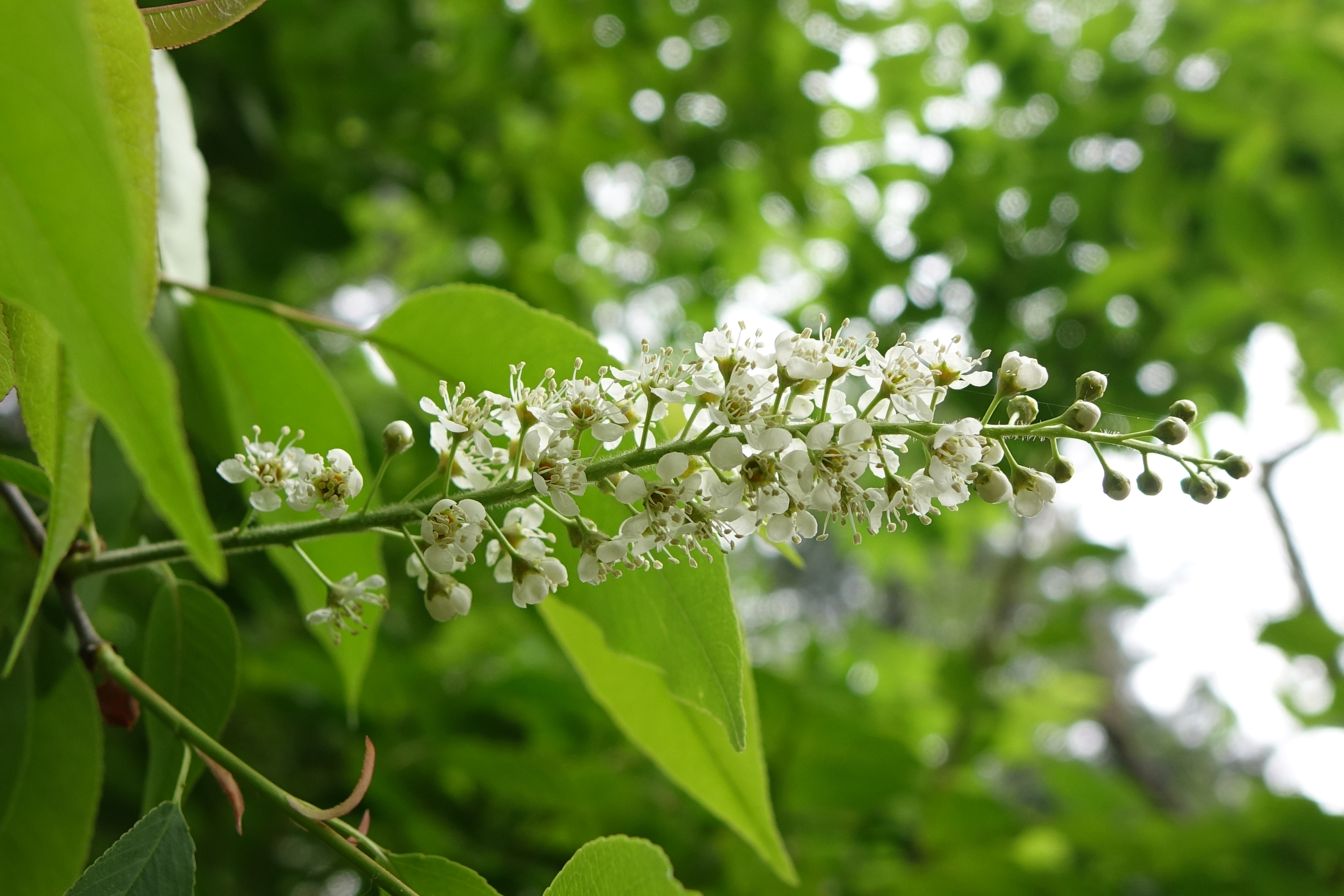 이 꽃은 우리나라 산에 자생하는 귀룽나무와 비슷하다. 5월 중순에 새로 난 가지 끝에서 총상꽃차례(긴 꽃대에 꽃자루가 있는 여러 꽃이 어긋나게 붙어 밑에서부터 피는 꽃차례)로 피는데, 꽃대에 40개쯤 달려 기다란 원뿔 모양의 꽃송이를 이룬다. 각 꽃은 흰 꽃잎과 꽃받침조각 5개, 암술 1개, 수술 20여 개다. 꽃받침조각은 삼각형이고 가장자리에 선(線) 모양의 톱니가 있다. 꽃대에는 잔털이 있거나 없고, 꽃자루에는 잔털이 없다.