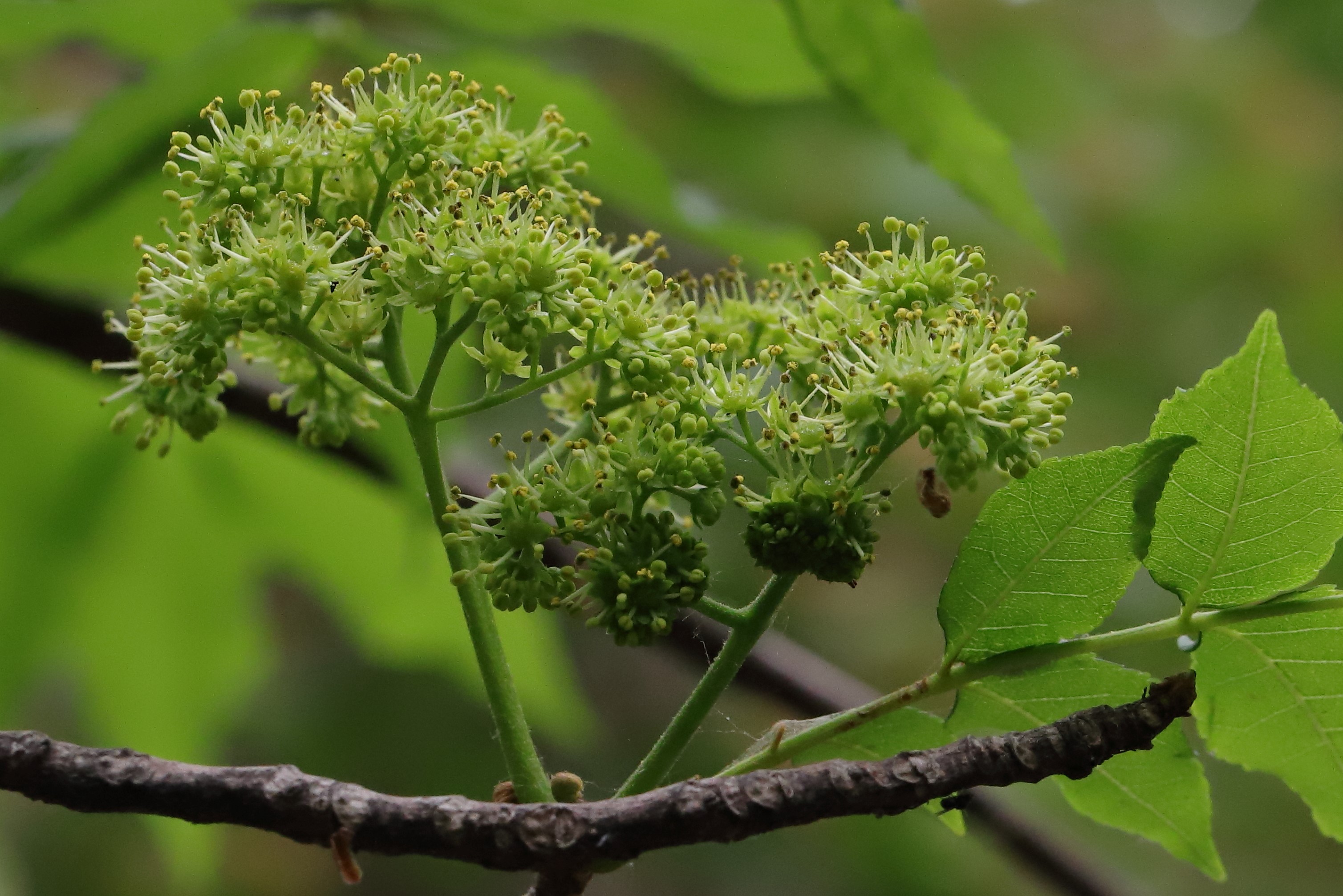 꽃은 5월 중순에 암나무와 수나무에서 각기 따로 핀다. 꽃차례는 먼저 꽃대 끝에 꽃이 피고, 이어 그 주변의 가지 끝에 꽃이 핀 뒤, 거기서 또 갈라져 나간 가지 끝에 꽃이 피는 취산꽃차례다. 취산(聚散), 즉 하나의 이삭으로 모여 있지만[聚], 각 꽃이 뿔뿔이 흩어진[散] 꽃차례인 것이다. 암꽃과 수꽃 모두 4~5개의 꽃잎과 꽃받침조각, 4개의 수술을 지녔다. 암꽃에서는 암술머리가 4개로 갈라진 암술과 퇴화해 길이가 짧아진 수술을 볼 수 있다.