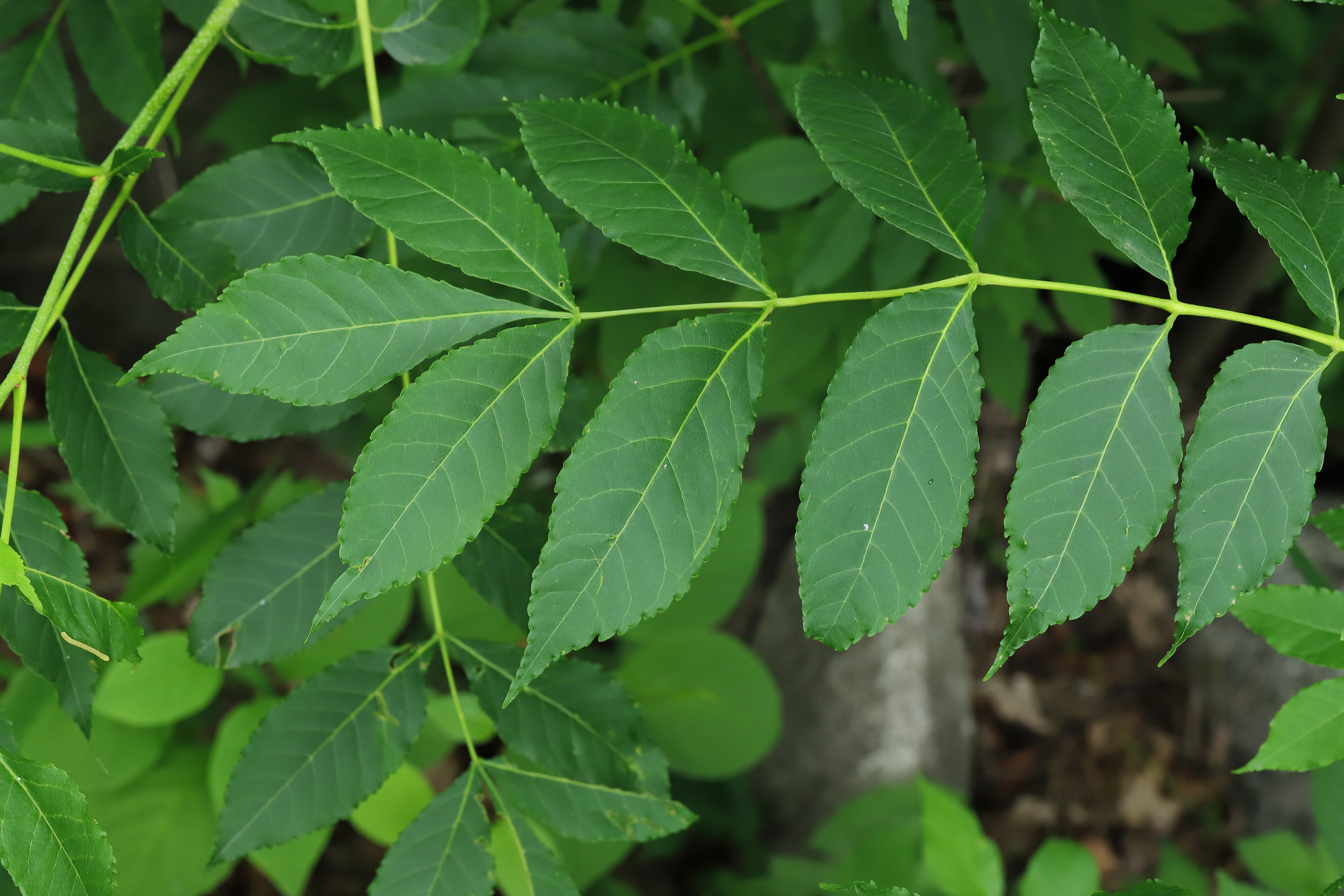 잎은 9~15개의 잔잎으로 이루어진 홀수깃꼴겹잎으로, 어긋나기를 한다. 마주난 잔잎은 달걀꼴로 길쭉하면서 잎끝이 매우 뾰족하고, 잎밑이 비대칭을 이루어 약간 둥그스름하다. 잔잎 앞면은 광택이 약간 나면서 털이 없고, 뒷면 잎맥에 털이 있기도 하고 없기도 하다. 가장자리에는 잎끝 쪽으로 굽은 물결 모양의 둔한 톱니가 있다.
