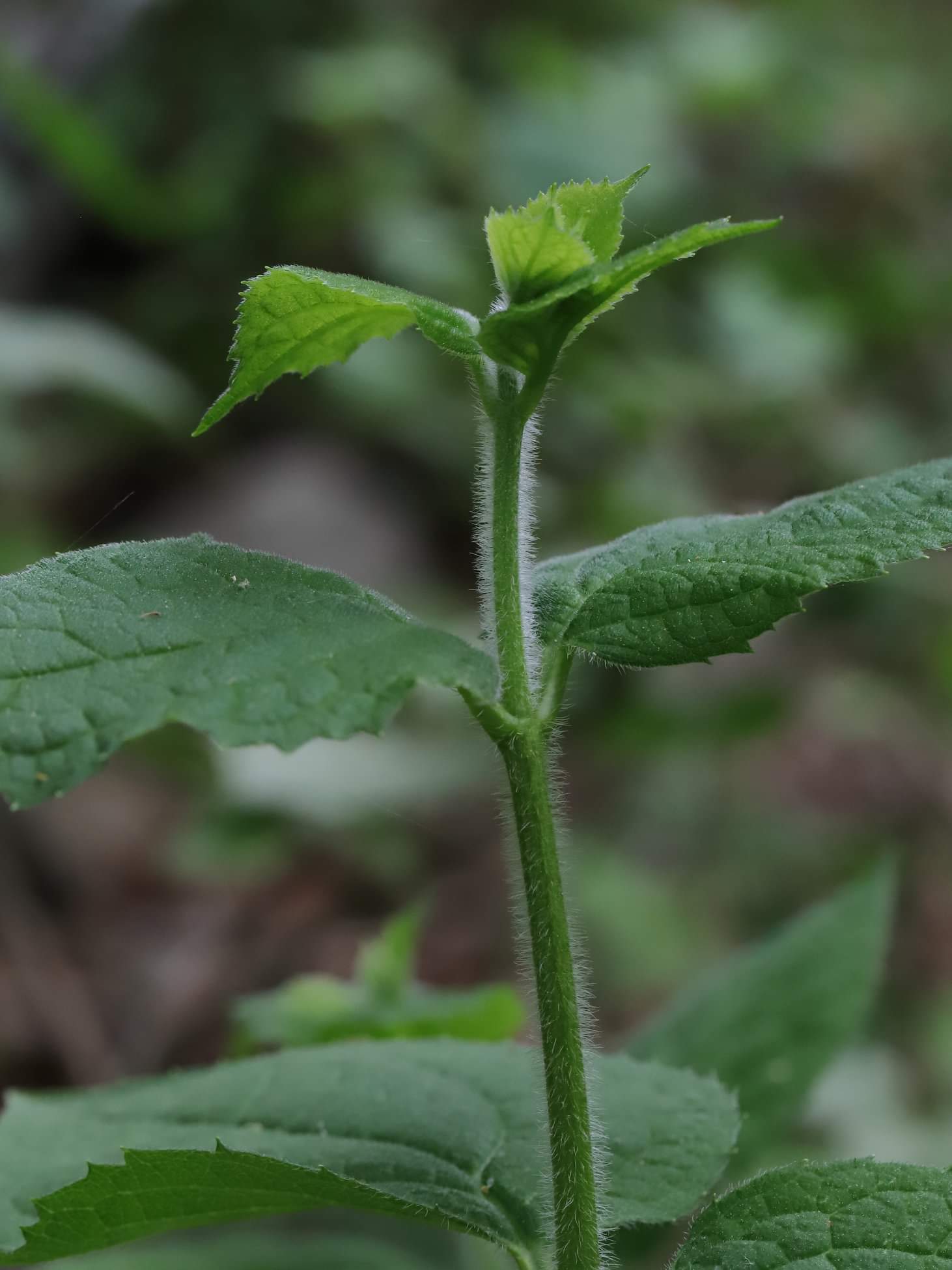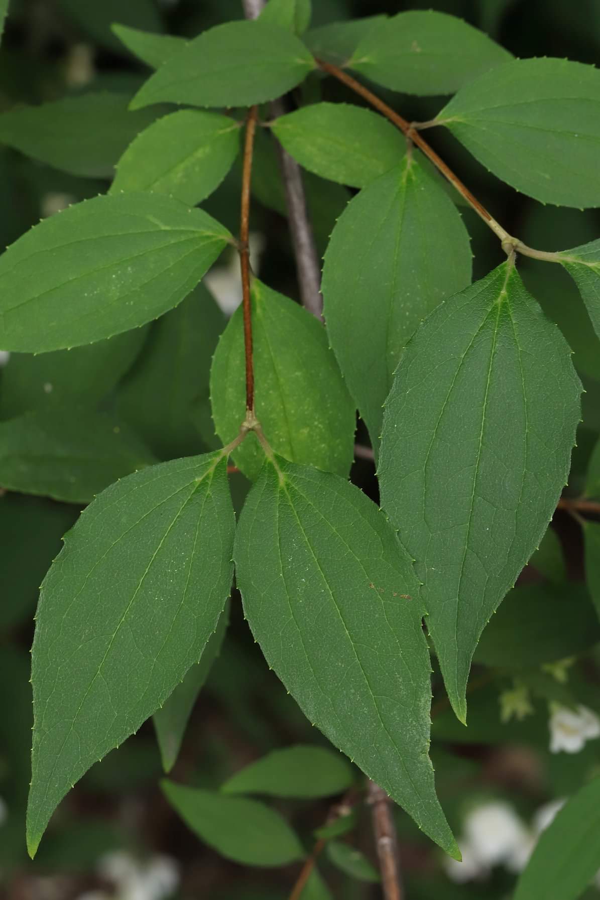 잎은 달걀꼴로, 끝이 점차긴뾰족끝(점첨두)이고 밑이 넓은뾰족밑(광예저)이며, 가장자리에 짧은 톱니가 있다. 톱니의 요부(凹部)는 곡선으로 휘어져 들어간 경우가 많다. 어린잎일 때 잎 앞면에 잔털이 있으나 자라면서 거의 다 없어진다. 잎 뒷면 연녹색 잎맥 위에 잔털이 뚜렷하다. 잎차례는 마주나기다. 일년생 가지와 새 가지에도 잔털이 있다.