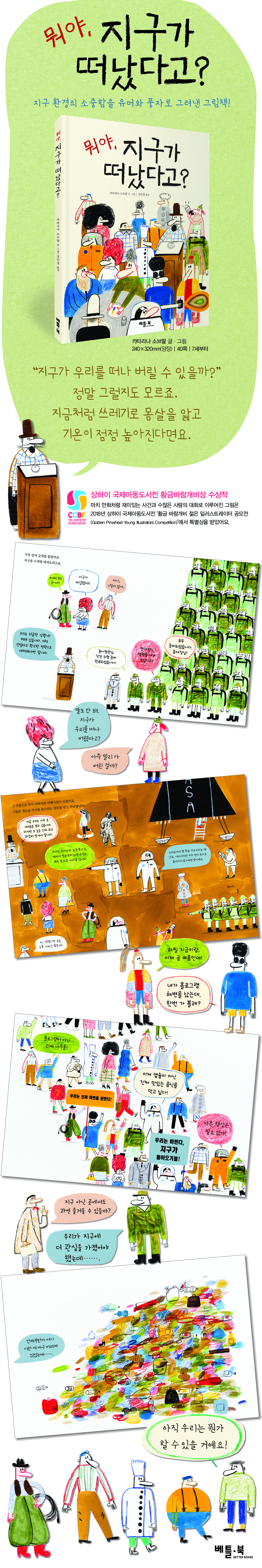 이 책은 지구 환경의 소중함을 새로운 형식으로 풀어낸 그림책이에요. 이야기가 흥미롭게 펼쳐지는 동안 많은 사람이 나와 저마다 한마디씩 하거나 대화를 나누어요. 누가 어떤 말을 하는지 알아보는 것도 재미있어요. 그런 말들은 지구가 사라진 뒤 뒤죽박죽이 된 세상에 관한 유머와 풍자를 담고 있어요.