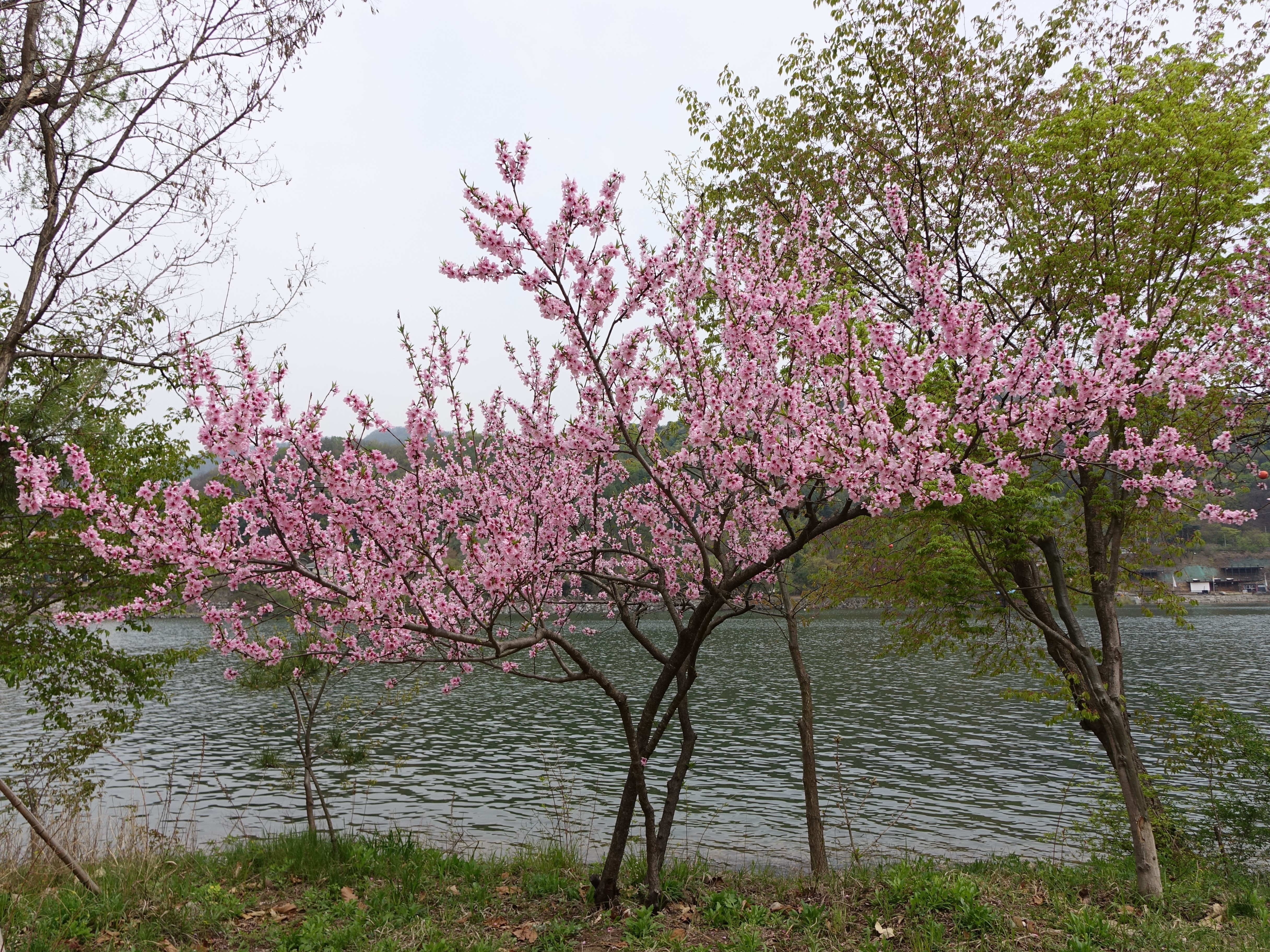 어린 복사나무 봄 못 이겨 꽃망울 터트리고