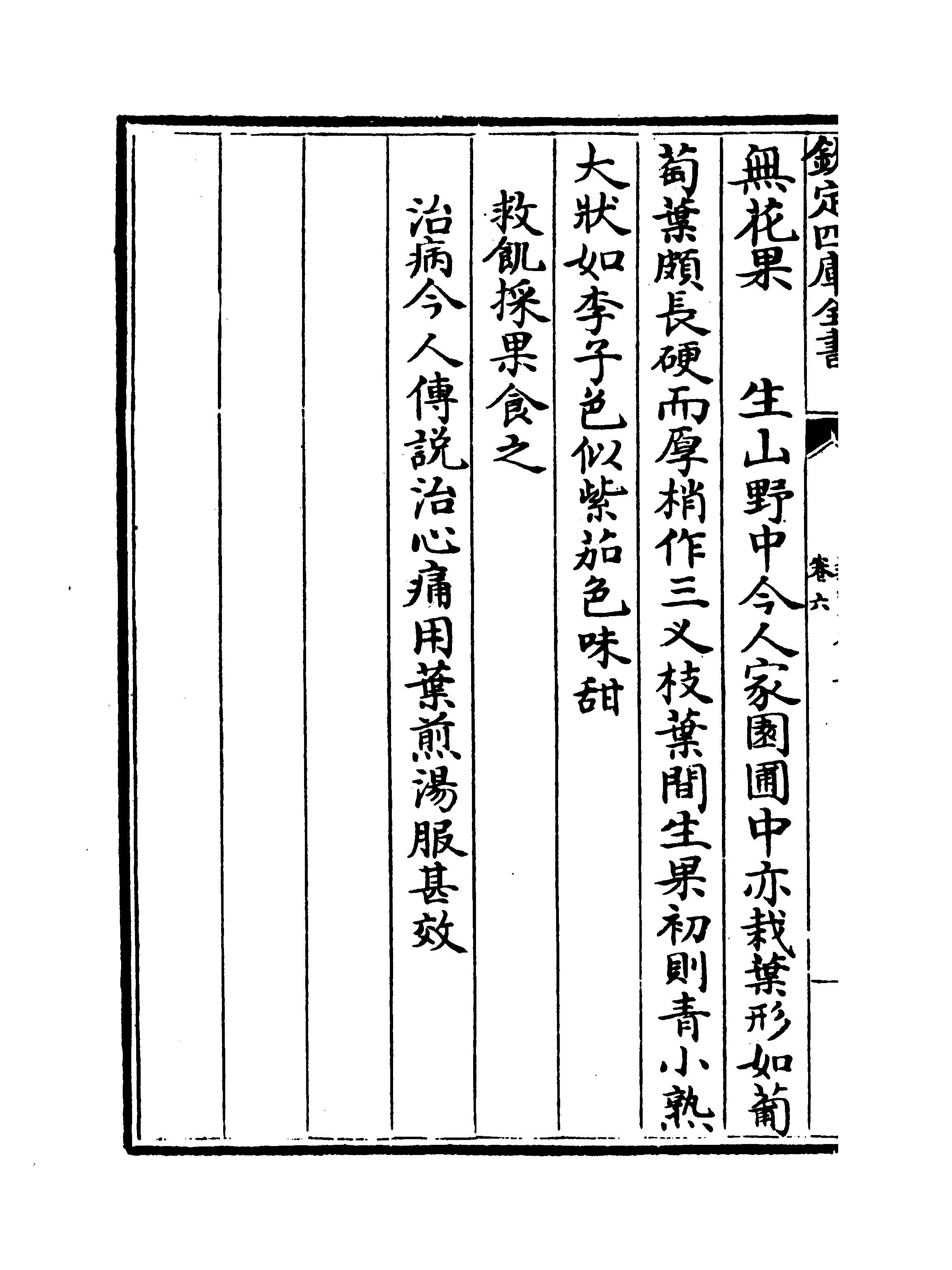 生山野中、今人家園圃中、亦栽。葉形如葡萄葉、頗長硬而厚、梢作三叉。枝葉間生果初、則青小、熟大狀如李子、色似紫茄色。味甜。