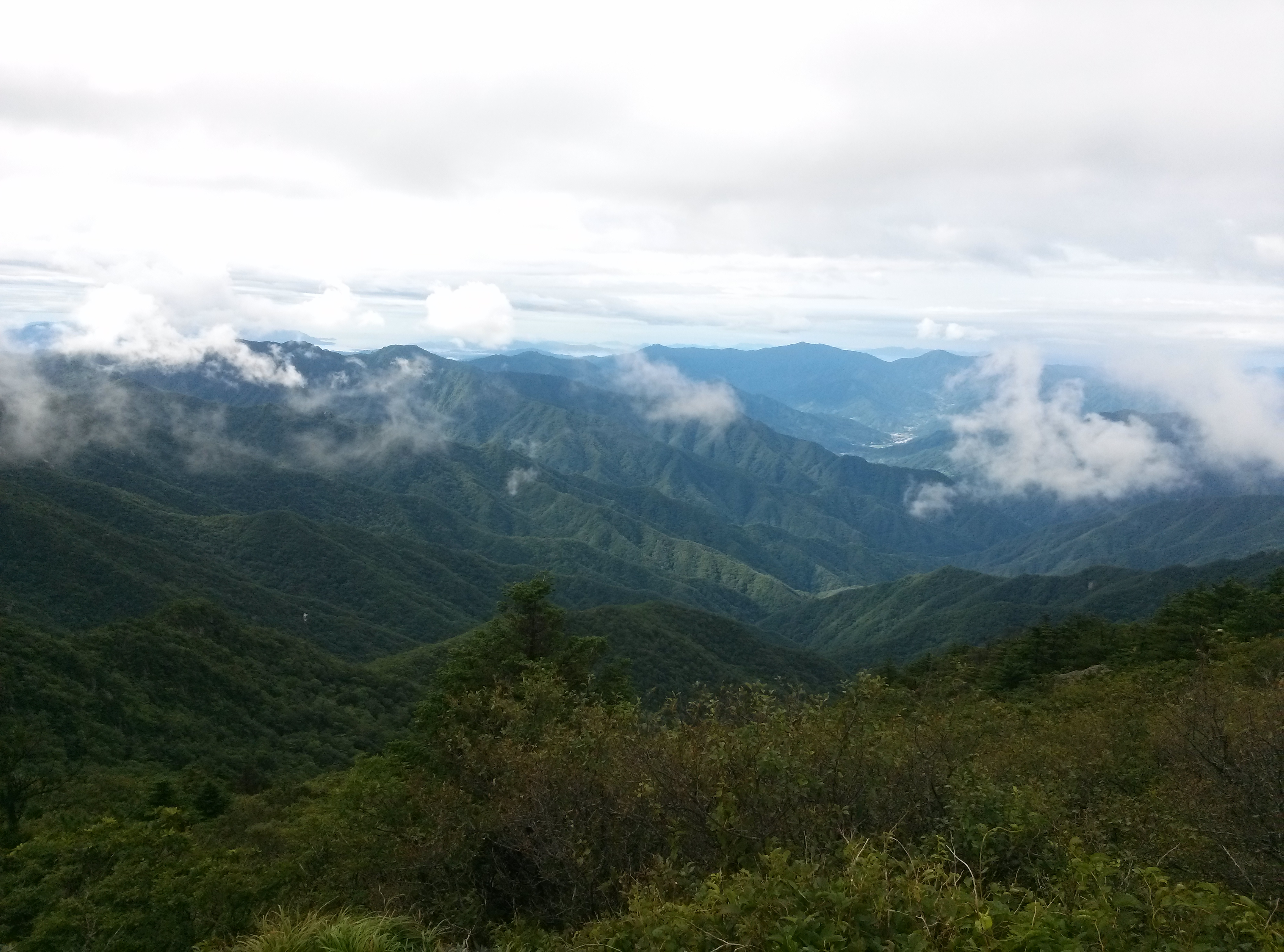 무거운 배낭을 지고 경사가 심한 코스로 오르려니 죽을 맛이었다. 천왕봉에 거의 도착해서는 비가 한바탕 쏟아졌다. 배낭을 멘 어깨가 벌겋게 부어오르고 아팠다. 수건을 몇 겹으로 접어 멜빵 밑에 대어도 도움이 안 됐다. 천왕봉에서 예약해놓은 대피소 방향으로 내려갈 때는 배낭을 마누라와 바꿨다. 더 이상 메면 어깨의 피부가 벗겨질 판이었다.
