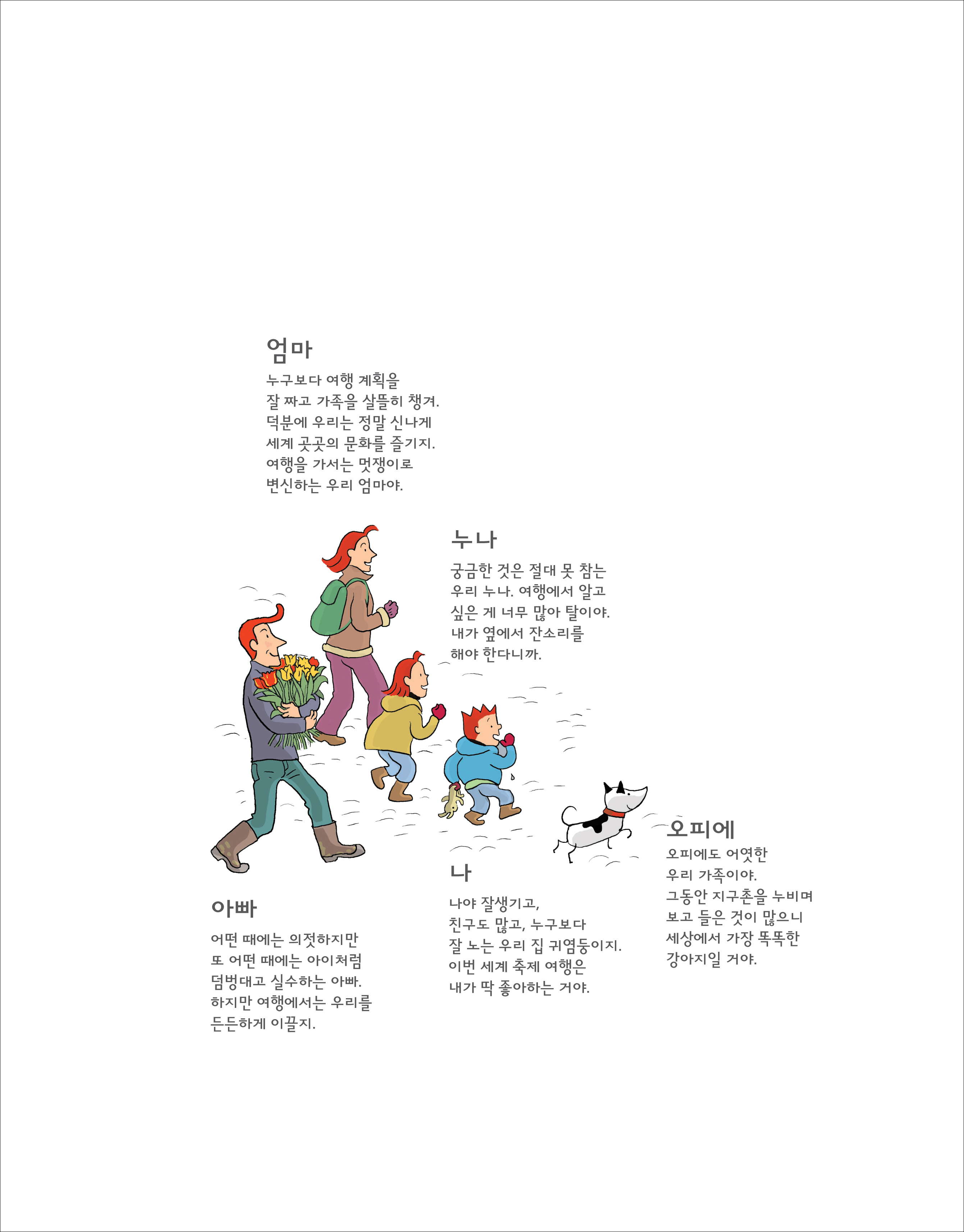 엄마, 아빠, 나, 누나, 그리고 강아지 오피에는 즐겁고 신나는 축제를 찾아 세계 곳곳으로 여행을 떠났어요. 미국 뉴욕의 새해 전야제, 칠레 이스터섬의 문명을 기리는 축제 타파티 라파누이, 중국의 춘절, 봄이 온 것을 축하하는 벨기에의 뱅슈 카니발, 모로코의 전통 음악 축제, 프랑스 보스 평야의 수확 축제 등을 즐기며 세계의 다양한 문화를 알게 됐어요.