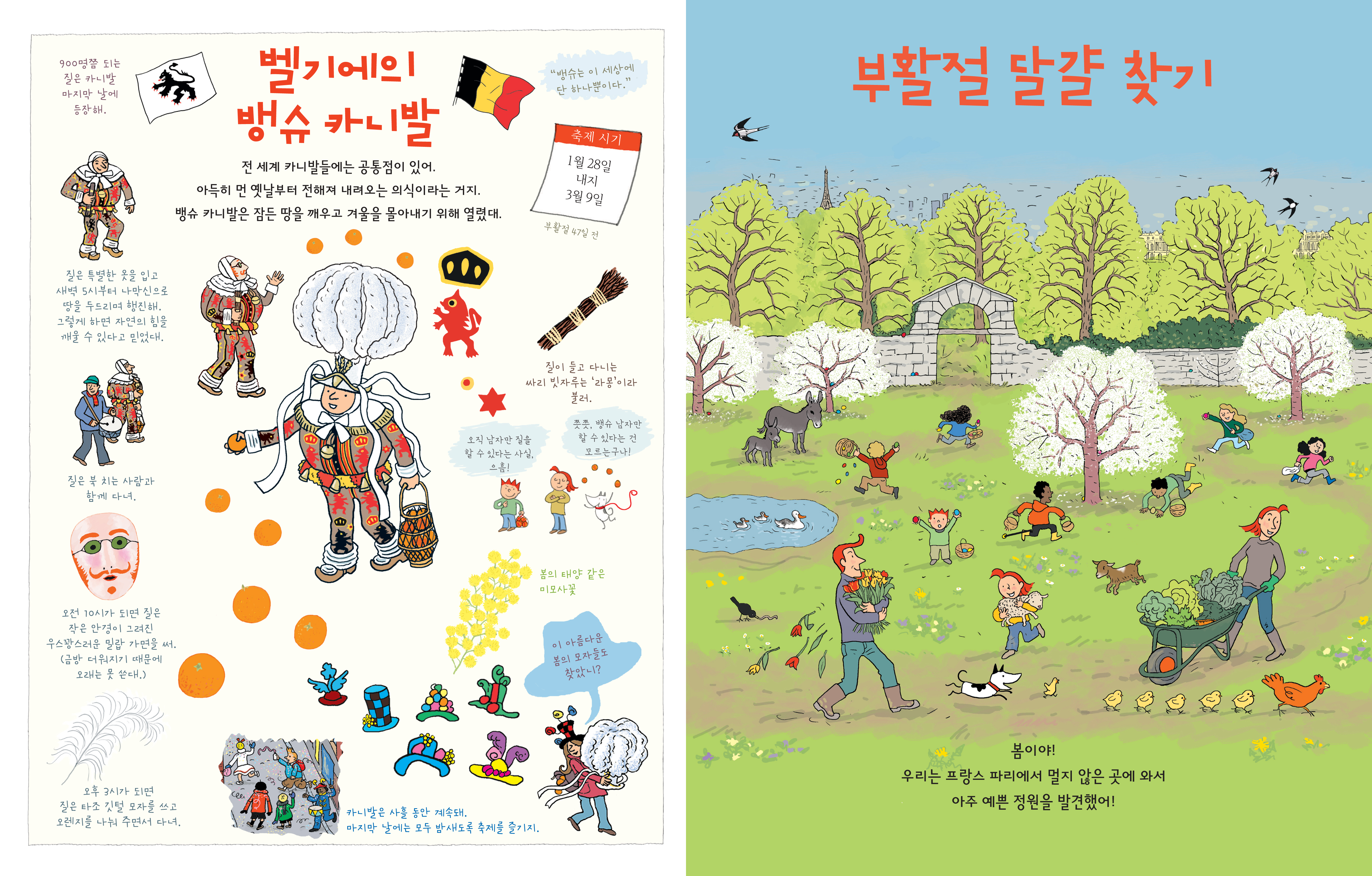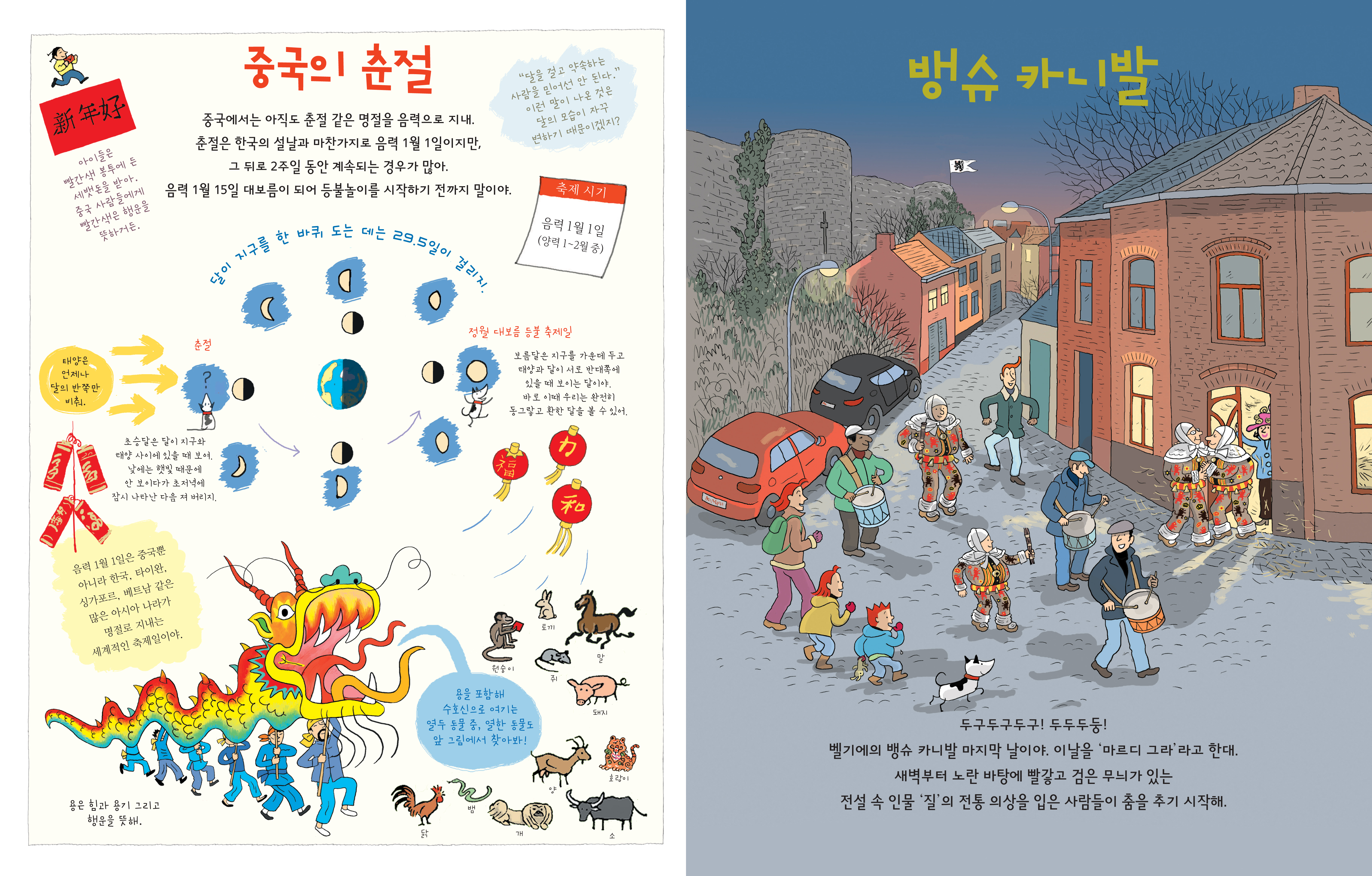 12월 31일 미국 뉴욕의 새해 전야제에 참가한 다음 날에는 센트럴 파크로 가서 수많은 사람과 스케이트를 탔어요. 2월, 칠레의 이스터섬에서 열리는 ‘타파티 라파누이’ 축제에서는 신비한 모아이 석상을 구경하고 원주민 전통 춤을 배웠어요. 중국의 춘절, 벨기에의 뱅슈 카니발, 프랑스의 부활절 달걀 찾기, 모로코의 그나우아 음악 축제……. 1월부터 12월까지 지구촌 축제를 알아보고 숨은 그림도 찾아요.