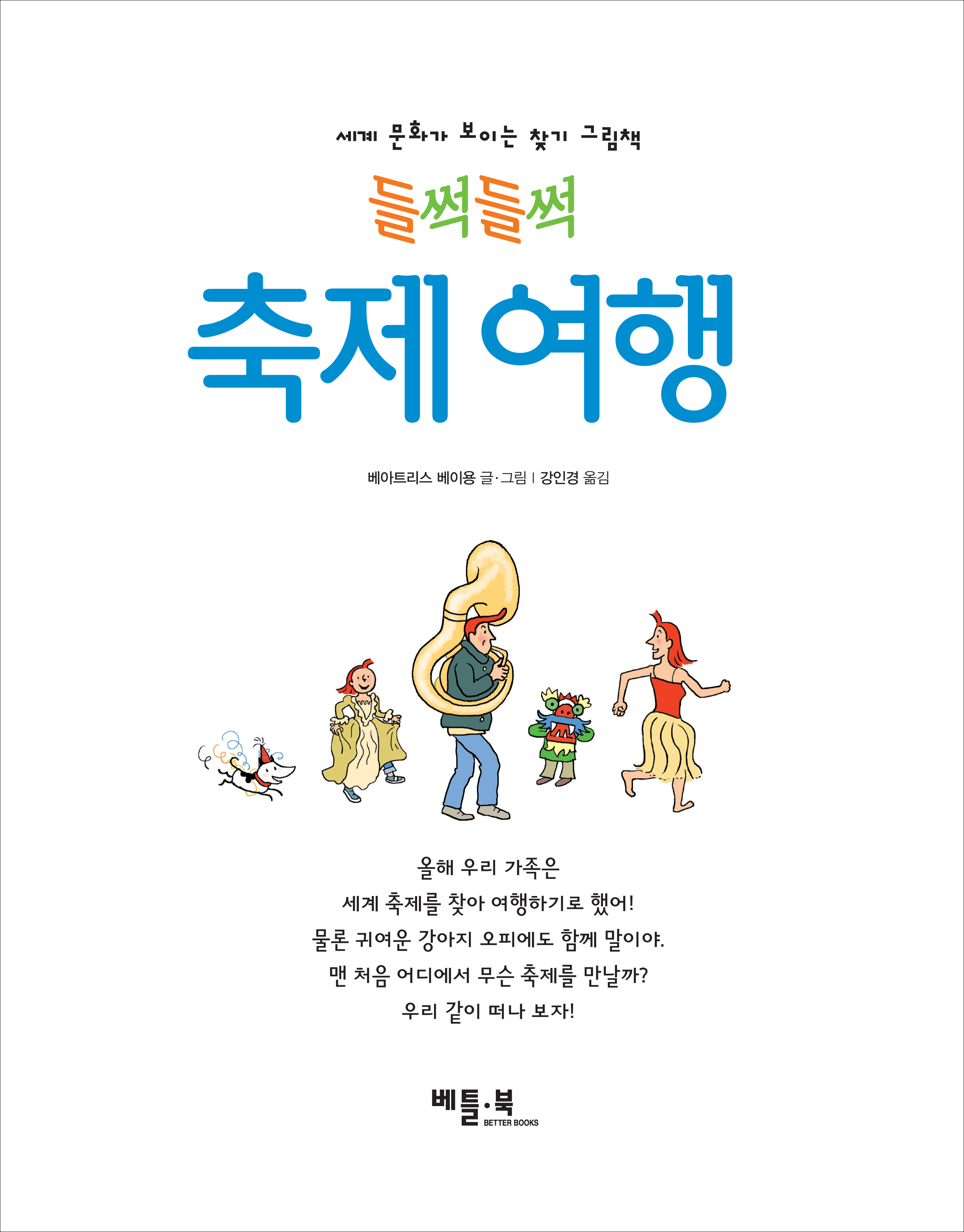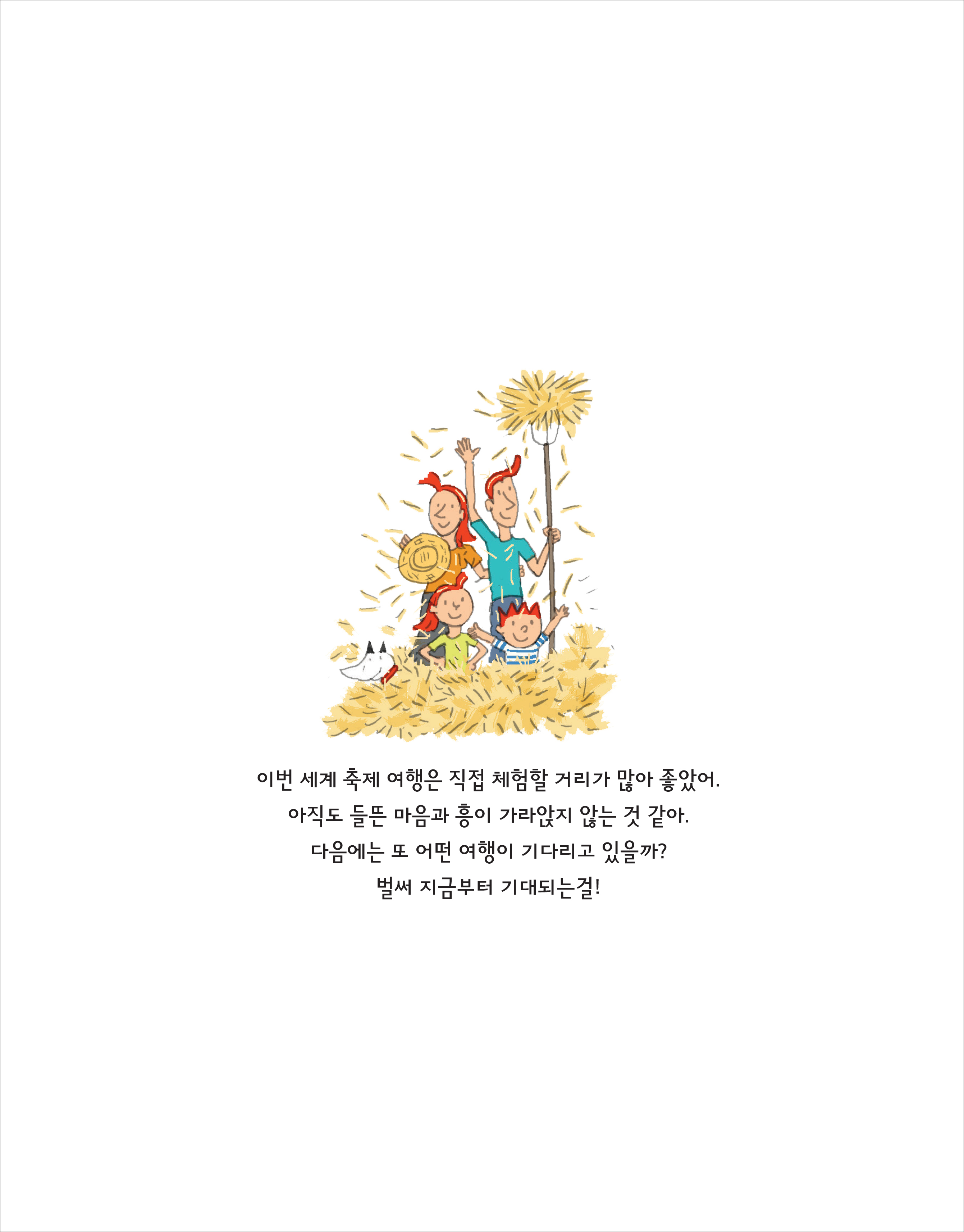 이번에 우리 가족은 흥겹고 신나는 축제를 찾아 세계 곳곳으로 여행을 떠났어요. 축제를 만날 때마다 가슴이 두근두근 뛰고 어깨가 들썩들썩했어요.