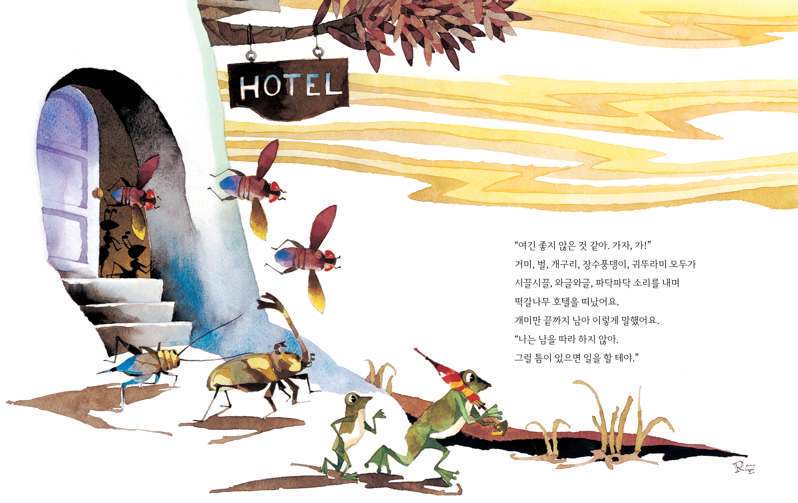 거미, 벌, 개구리, 장수풍뎅이, 귀뚜라미 모두가 시끌시끌, 와글와글, 파닥파닥 소리를 내며 떡갈나무 호텔을 떠났어요.
