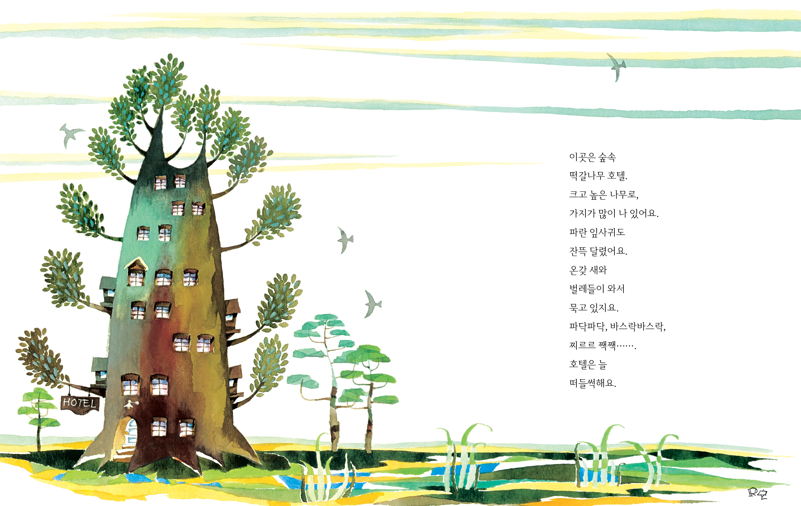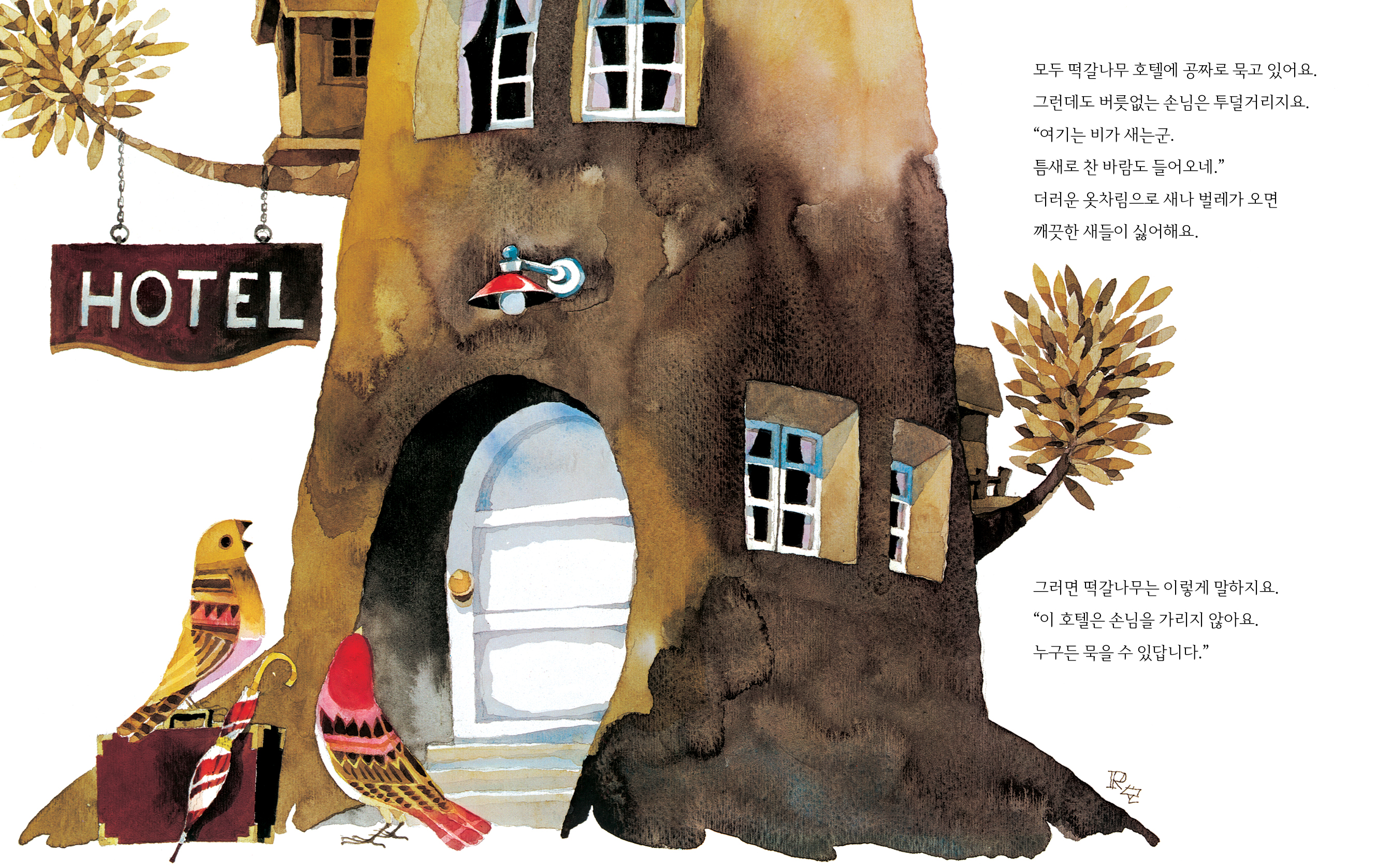 아주 크고 높은 떡갈나무는 그 자신이 호텔입니다. 이곳에는 온갖 새와 벌레들이 공짜로 묵고 있습니다. 떡갈나무는 손님을 가려 받지 않습니다. 더러운 옷차림을 한 손님이 찾아오면 다른 손님들이 싫어하지만, 떡갈나무는 이렇게 타이릅니다.