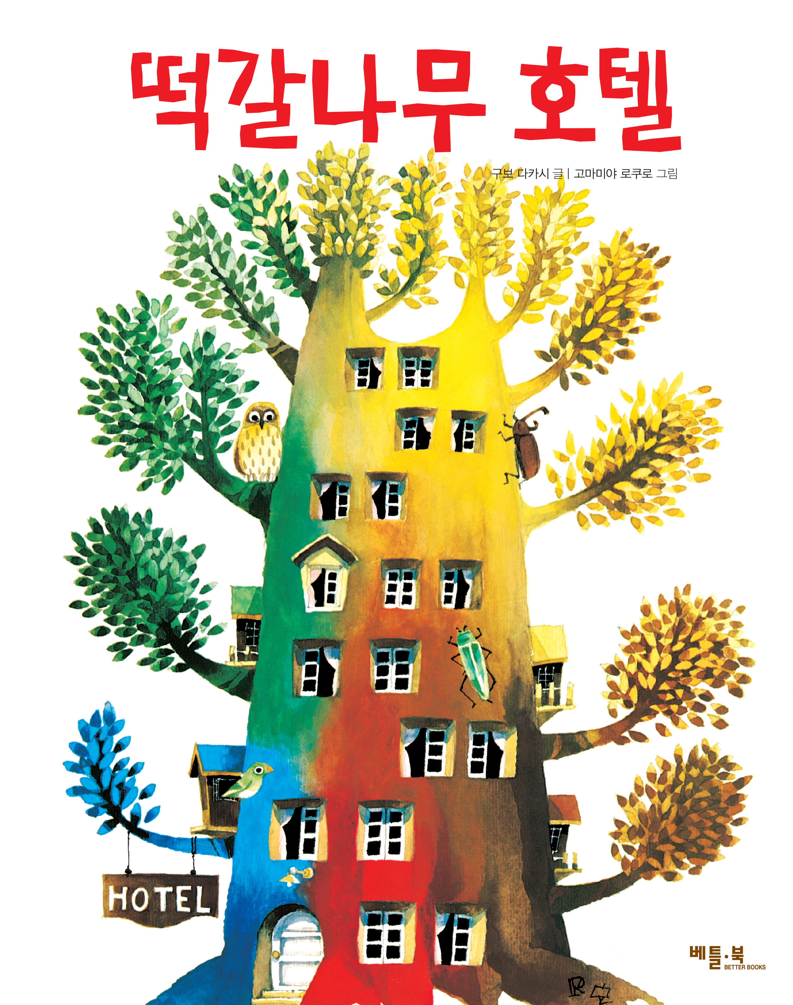 떡갈나무 호텔은 엄마의 사랑처럼 늘 변함이 없습니다. 언제나 똑같은 자리에 서서 매미, 개구리, 장수풍뎅이, 비단벌레, 동박새, 올빼미 같은 손님들에게 보금자리와 바람막이가 되어 줍니다.