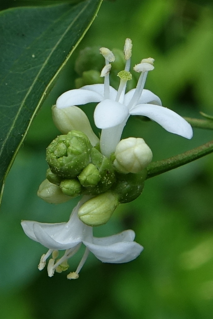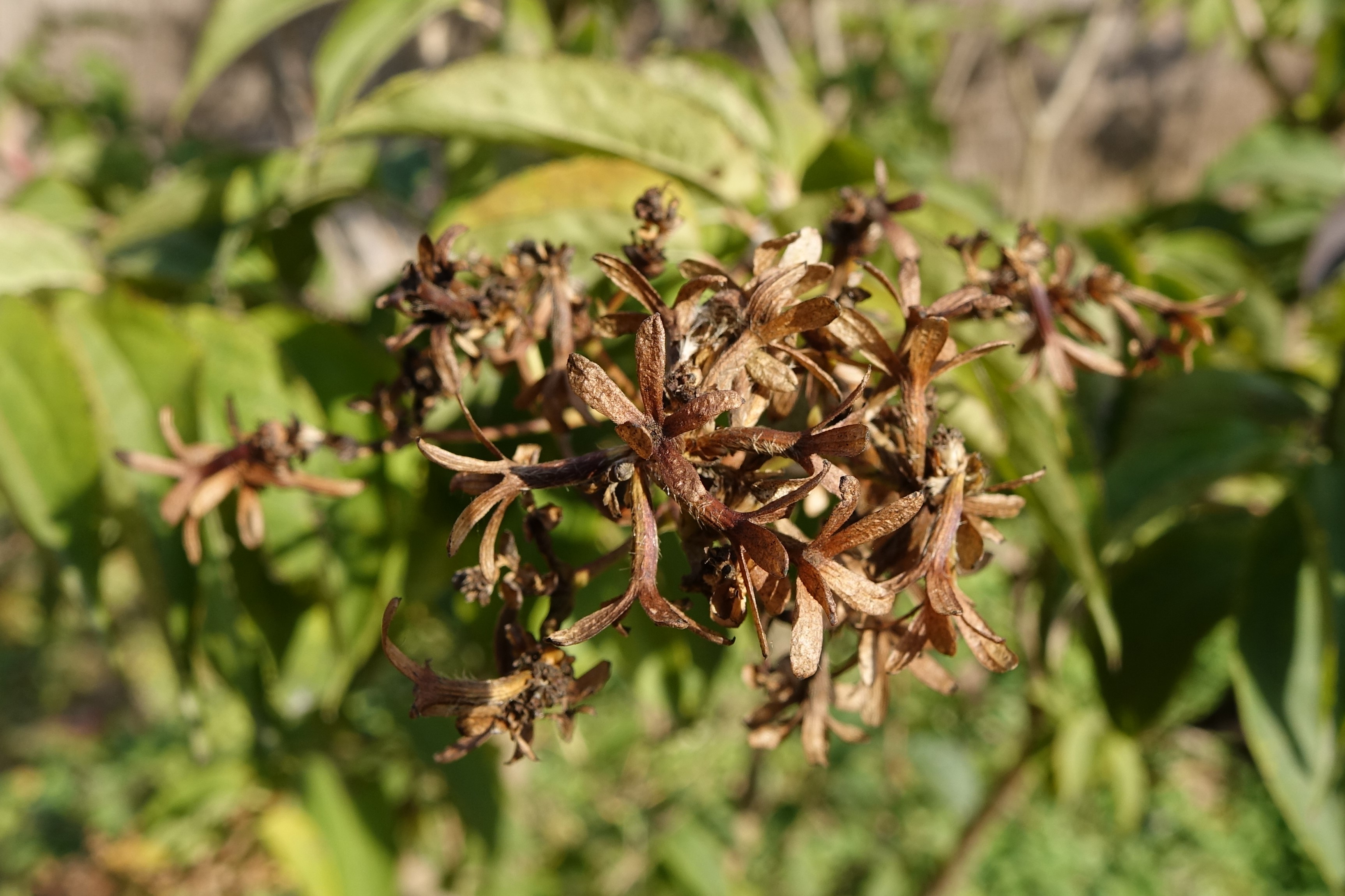 그렇다고 일곱 개의 꽃이 한 덩어리로 피는 것은 아니다. 작은꽃대 끝의 미성숙 꽃봉오리를 중심으로 여섯 개의 꽃이 빙 둘러 핀다. 꽃봉오리일 때는 일곱 개가 머리 모양을 이룬다. 자세히 보면 작은꽃대 끝 미성숙 꽃봉오리는 일곱 개의 자잘한 꽃봉오리 싹으로 되어 있다. 그러니까 여섯 개의 꽃이 핀 뒤 그 위로 여섯 개의 꽃이 다시 피고 거기서 또다시 여섯 개의 꽃이 피는, 필 수 있는 데까지 끝없이 꽃을 피워 올라가는 무한꽃차례다.