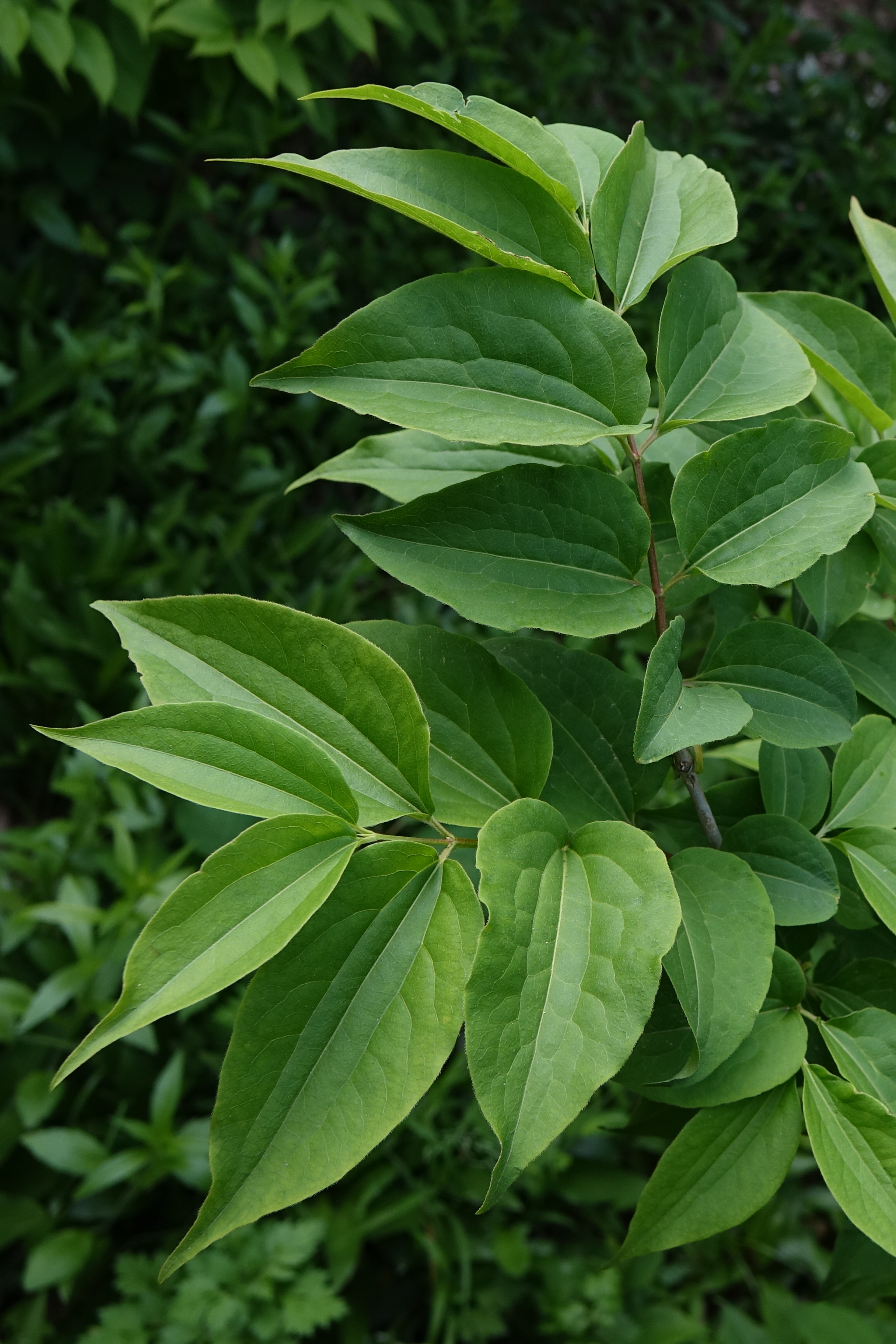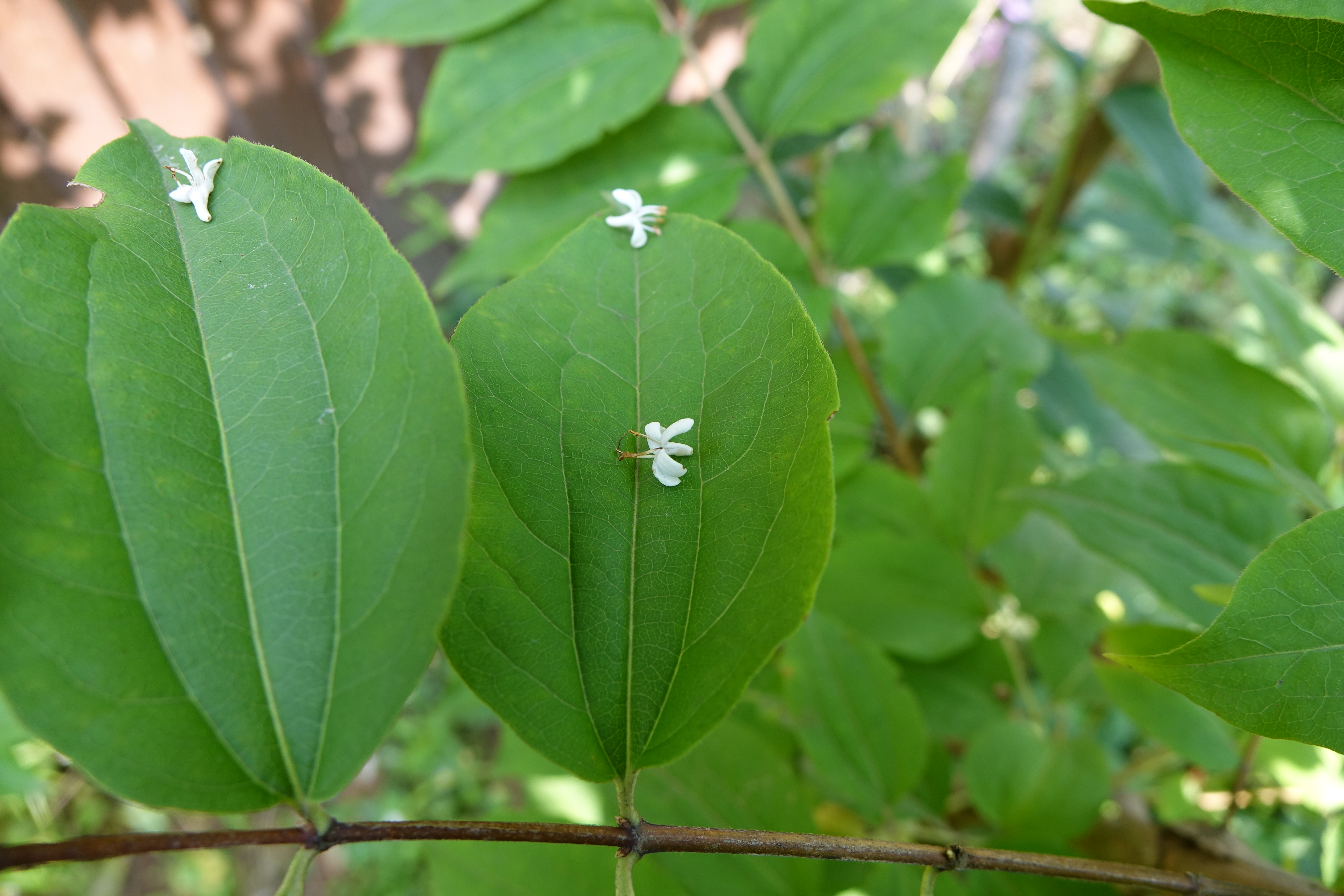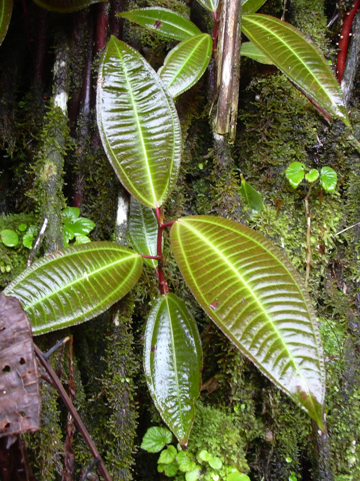 달걀꼴 혹은 긴달걀꼴 잎은 마주나기를 한다. 잎맥은 손바닥 모양의 장상맥(掌狀脈)으로 잎밑에서 3개의 주맥이 잎끝으로 길게 뻗어 다시 하나로 모이거나 중간에 흐려진다. 마치 나뭇잎 한가운데에 날렵하게 생긴 버들잎을 한 장 더 올려놓은 것 같다. 종소명 미코니오이데스(miconioides)는 이런 독특한 잎 모양을 나타낸다. 이는 ‘미코니아(Miconia)와 비슷한’이라는 뜻으로 칠자화 잎, 특히 그 잎의 주맥이 중앙아메리카 등지에서 볼 수 있는 미코니아속(屬) 식물과 비슷하게 생겼음을 말한다.