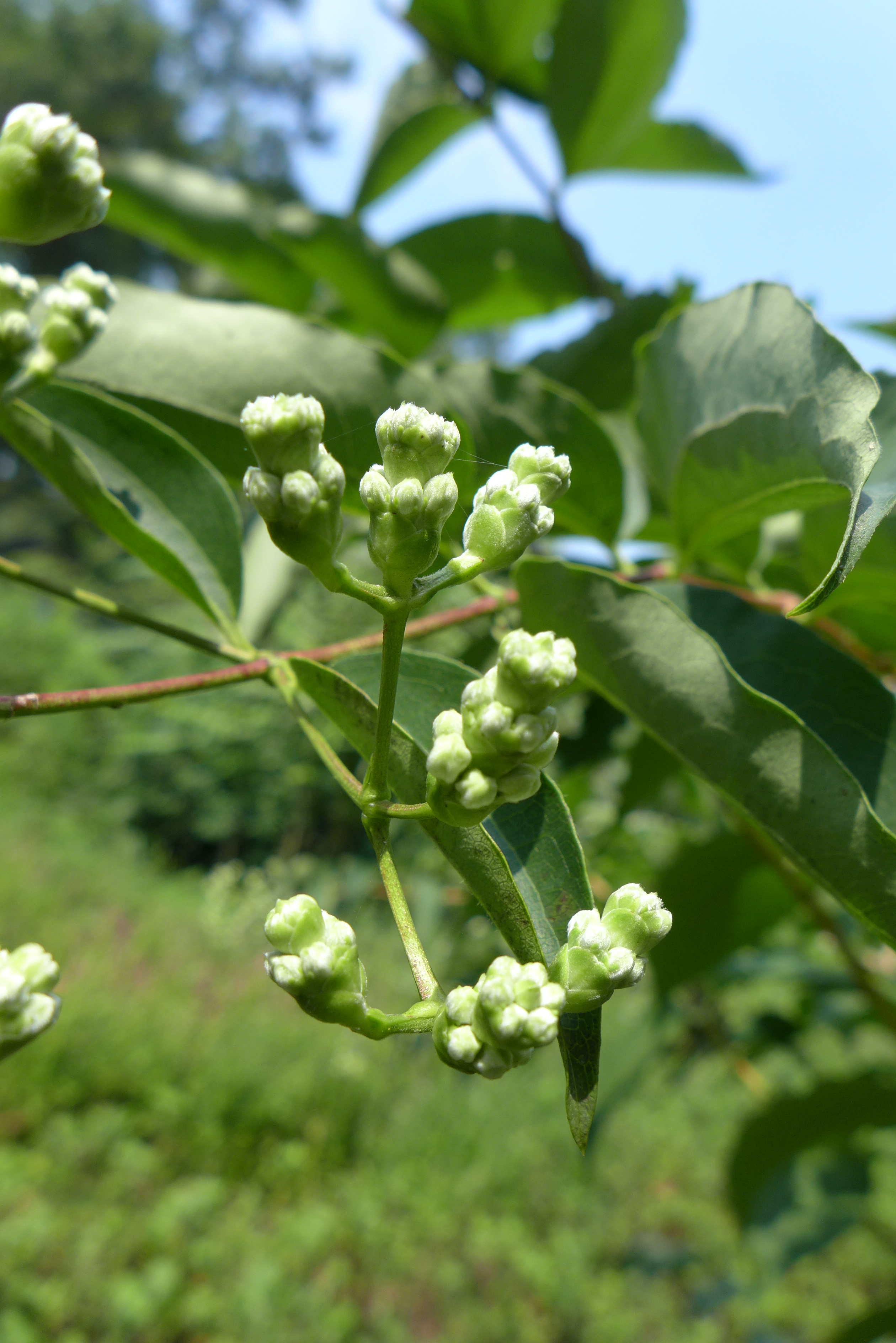 갈색 혹은 황갈색 수피는 세로로 길게 갈라지고 얇게 벗겨진다. 열매는 굳은씨열매(핵과)로, 붉은 꽃잎처럼 보이는 꽃받침 아래의 긴 씨방에서 9월부터 자라 10월이나 11월에 완전히 익는다. 길쭉하고 끝이 뾰족한 것이 꼭 육식 동물의 송곳니처럼 생겼는데, 그 길이는 1~1.5센티미터다.